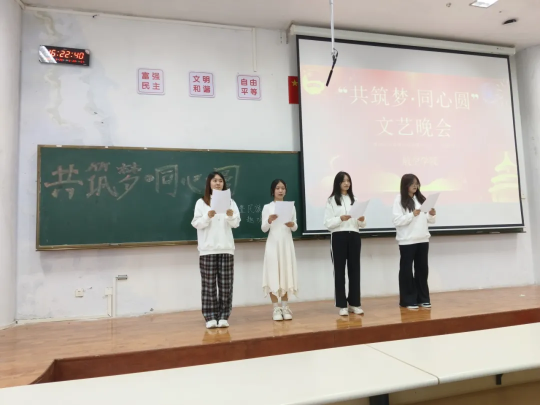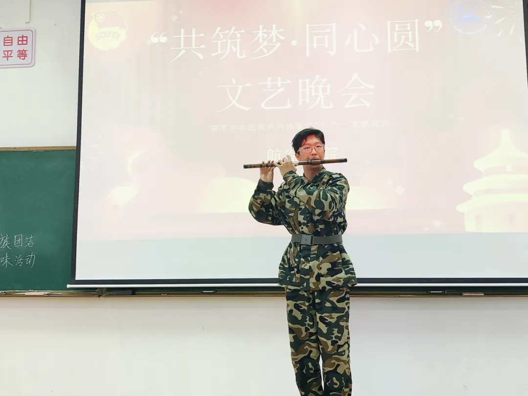 由大一新生带来的笛子独奏《青花瓷》,以及大二年级同学们表演的舞蹈《如愿》、合唱《我和我的祖国》充分表达了同学们对祖国的热爱。