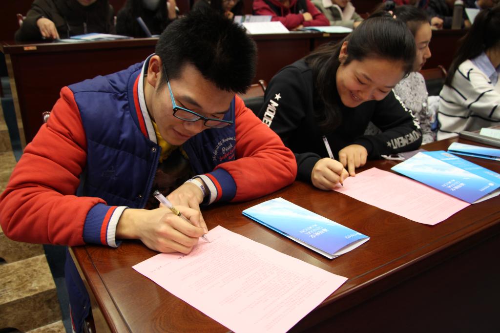 为切实让校纪校规入心入脑,认识诚信考试的重要性和考试违纪严重后果,王成结合近期违反公司考试规定的案列,为全体同学认真解读了《304永利集团员工违纪处理实施细则(2017年修订)》,并组织员工签署了“‘为心灵签约’——304永利员工诚信考试承诺书”。要求全体同学,继续保持通过这一学期的早跑操、晚自习、无手机课堂、专业特色讲坛等举措而形成“乐学、勤学、善学”的良好风气,进一步培养自立自律、刻苦学习,诚信考试,公平竞争的作风。