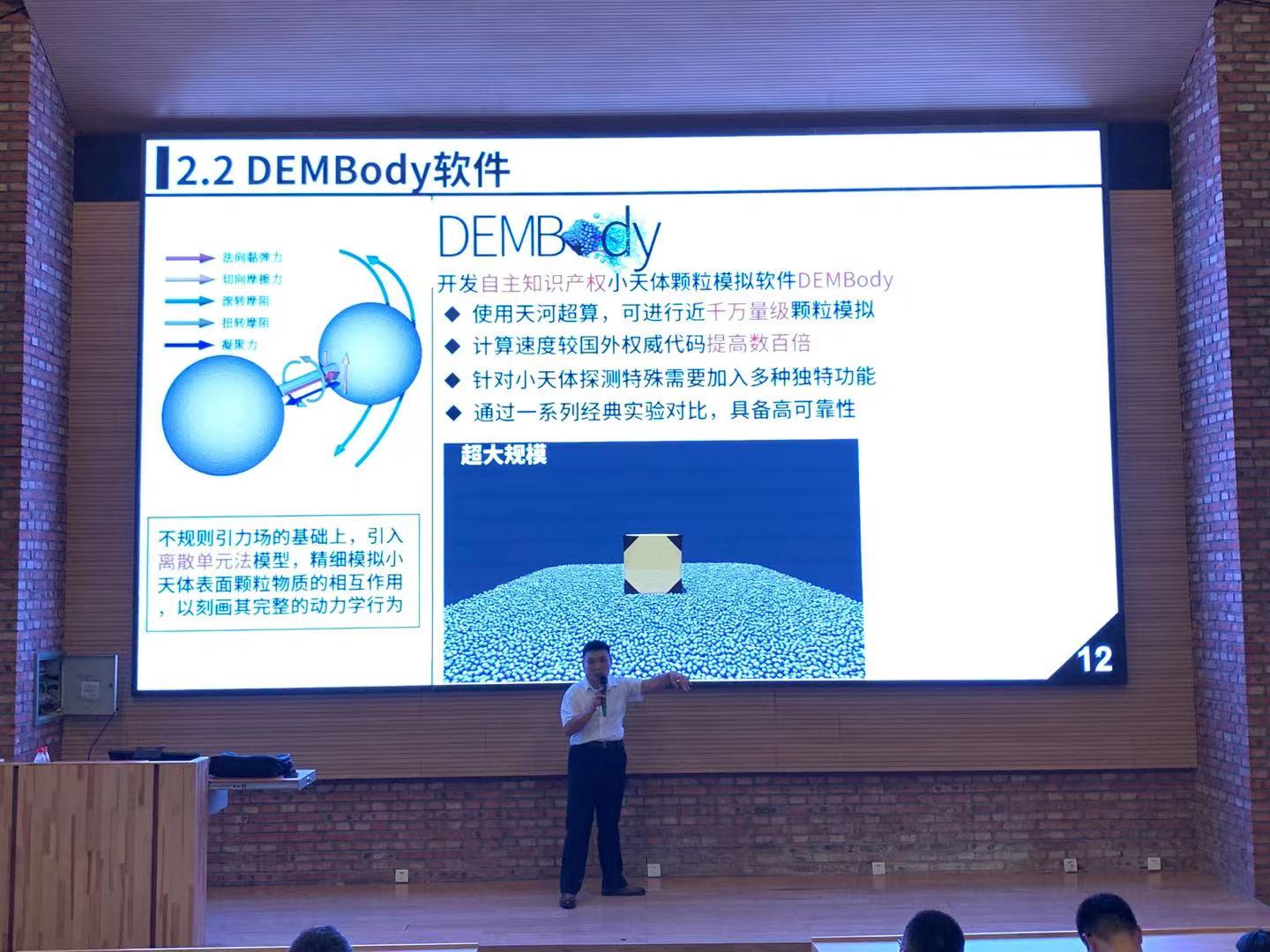 讲座中,宝音教授从小天体探测的原因和重要性入手,详细阐述了在小行星捕获过程中所要研究的小行星表面物质的特性及目前几种捕获的手段。通过对小行星颗粒相互作用、碰撞的力学模型实验的动画演示,对小行星捕获的动力学方法做了生动的介绍,并解释了小行星探测的介观机理。