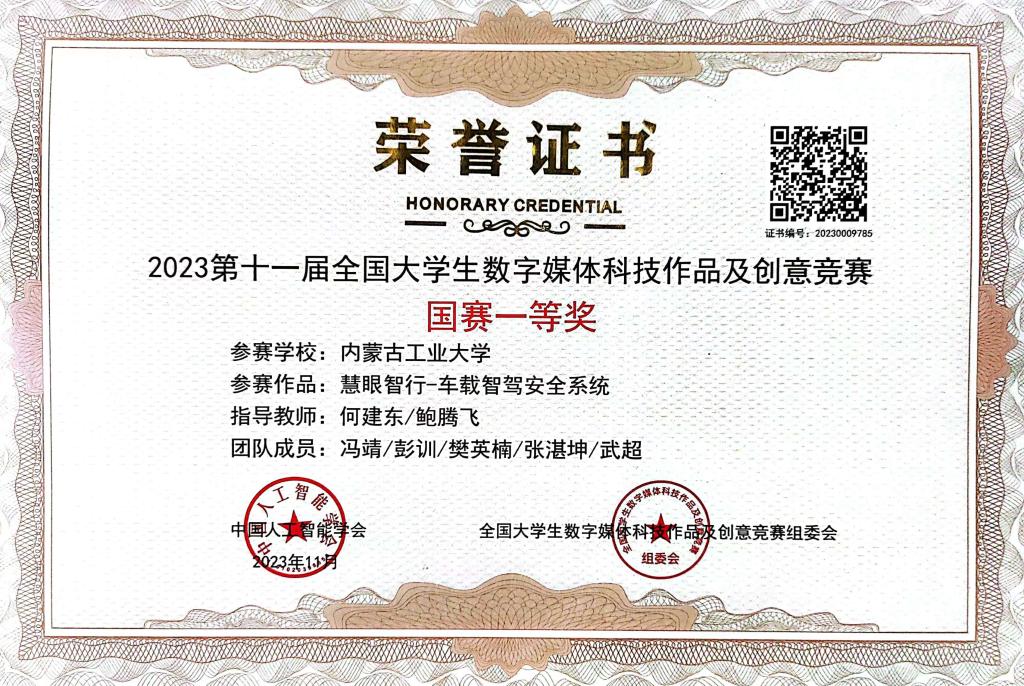 本届竞赛有近1300多所高校的7万多个参赛团队报名参赛,近20万名指导教师和员工参与。经过激烈角逐,由304永利何建东、电力公司鲍腾飞老师指导,电科20-2冯靖、自动化20-1彭训、交运(航)21-1樊英楠、交运(航)21-1张湛坤、电气20-1武超同学组成的项目团队制作的“慧眼智行-车载智驾安全系统”荣获国赛一等奖。304永利何建东老师、电力公司鲍腾飞老师获优秀指导教师称号。