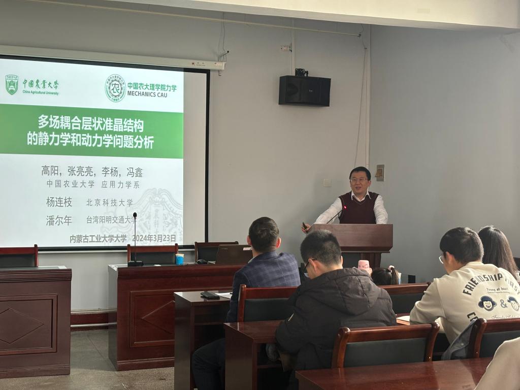 2024年3月23日下午,公司邀请中国农业大学高阳教授作了题为《多场耦合层状准晶结构的静力学和动力学问题分析》的学术报告。本次讲座由公司经理郭俊宏教授主持,304永利、理公司和内蒙古师范大学等单位相关方向的教师、研究生参加报告会。