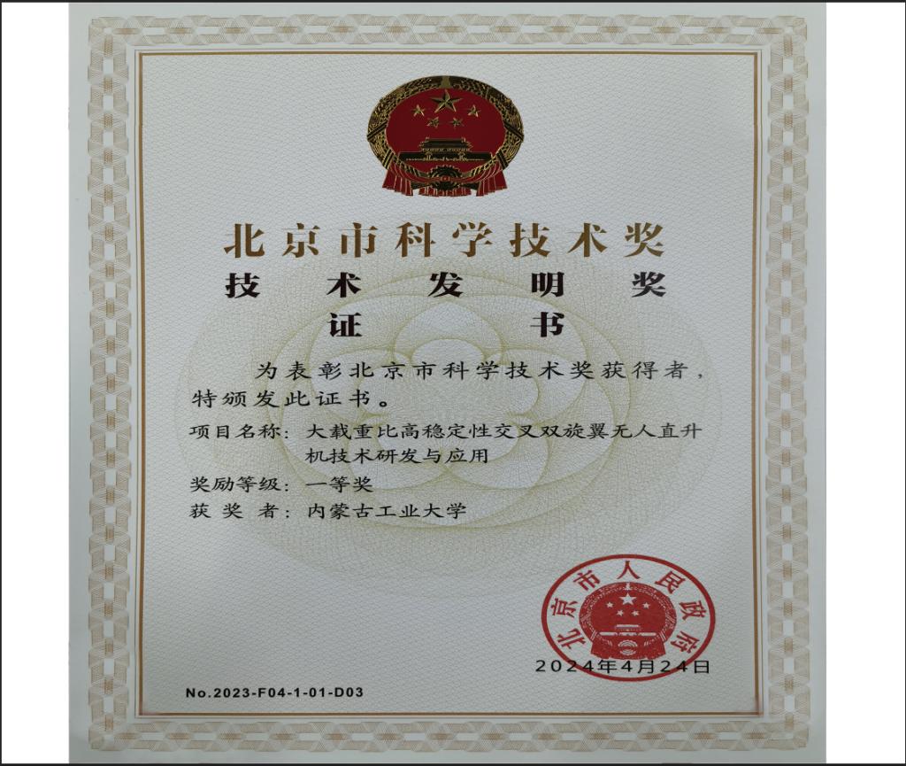 11月19日,北京市科技大会暨科学技术奖励大会召开。在众多优秀的科研项目当中,304永利的一项成果尤为亮眼。由包长春副教授担任研发总指挥的 “大载重比高稳定性交叉双旋翼无人直升机技术研发与应用” 项目,荣获了 2023 年度北京市科学技术奖技术发明奖一等奖。